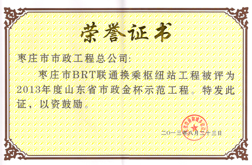 “棗莊市BRT聯(lián)通換乘樞紐站工程”被評(píng)為“2013年度山東省市政金杯示范工程”